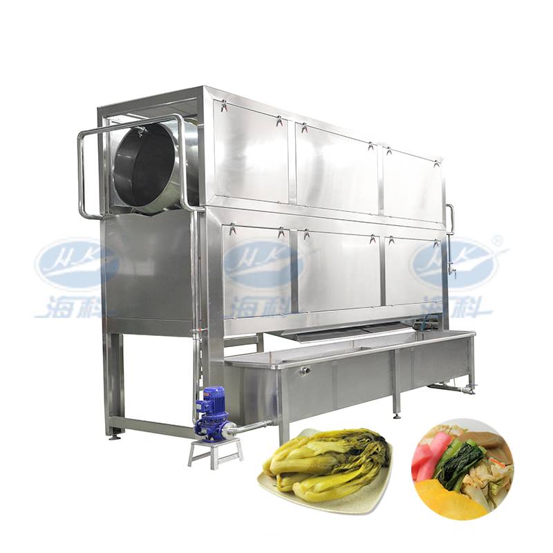 該產品適用于醬腌菜根莖類鹽漬后原料的清洗工藝,采用合理的筋肋滾筒結構,配有上噴淋機構,并設置水循環系統,節約水資源,改善生產環境,降低勞動強度,是根莖類醬腌菜原料清洗的理想裝備。